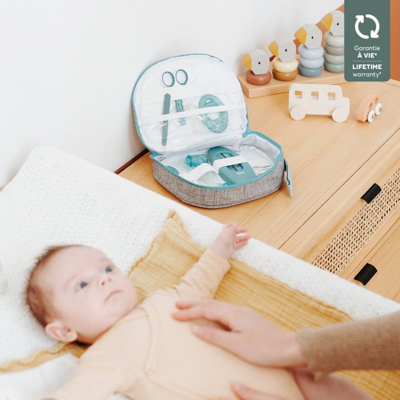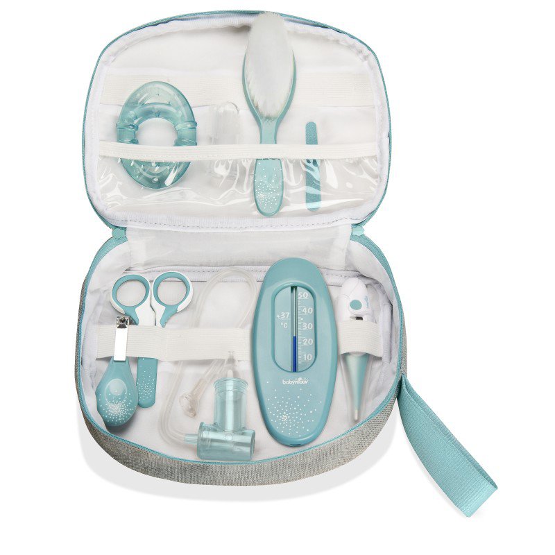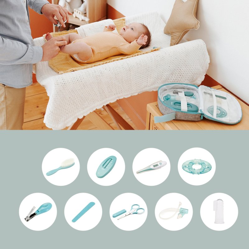 Hygienický set obsahující: 1 nosní odsávačku, 1 hřebínek, 1 nůžky s kulatou špičkou a krytem, 1 pilníček, 1 kleštičky na nehty, 1 silikonový kartáček, 1 digitální teploměr s ohebnou špicí a pouzdrem, 1 teploměr do vody a 1 kousátko.