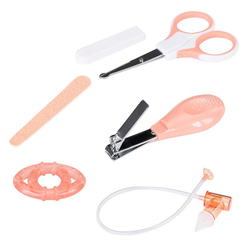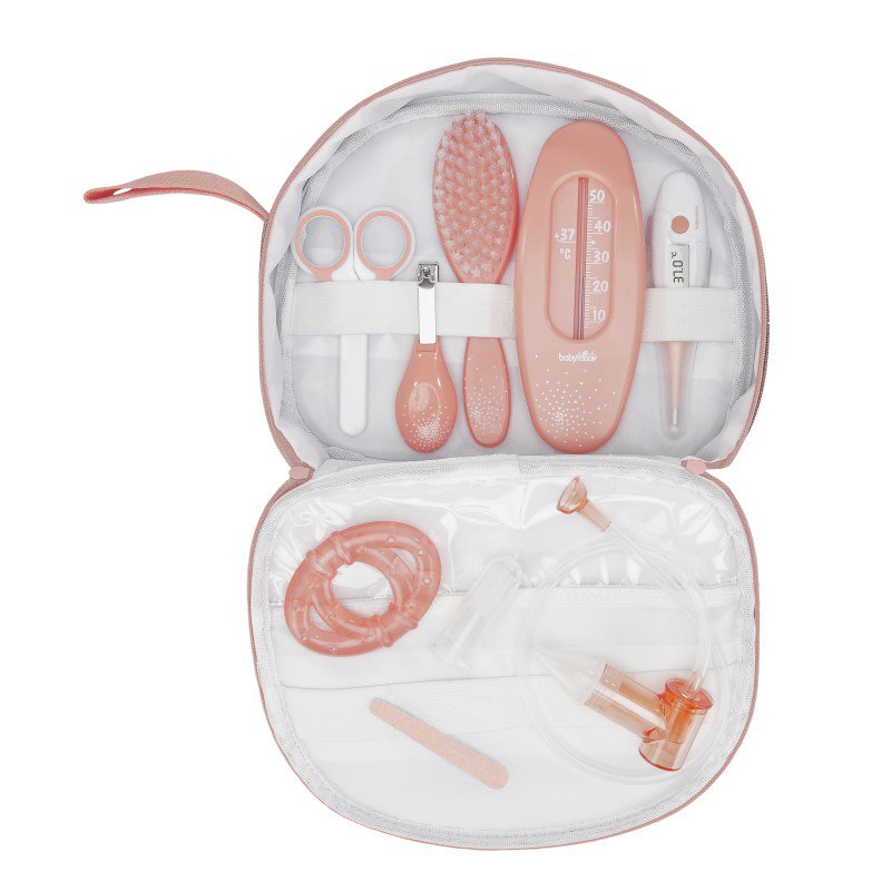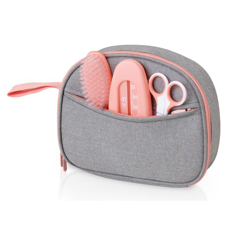 Hygienický set obsahující: 1 nosní odsávačku, 1 hřebínek, 1 nůžky s kulatou špičkou a krytem, 1 pilníček, 1 kleštičky na nehty, 1 silikonový kartáček, 1 digitální teploměr s ohebnou špicí a pouzdrem, 1 teploměr do vody a 1 kousátko.