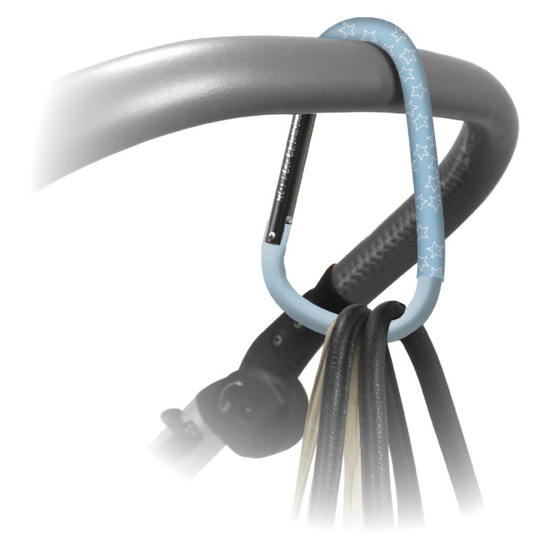 Háček / karabina pro upevnění kabelky, batohu nebo přebalovací tašky na rukojeti kočárku či nákupním vozíku.