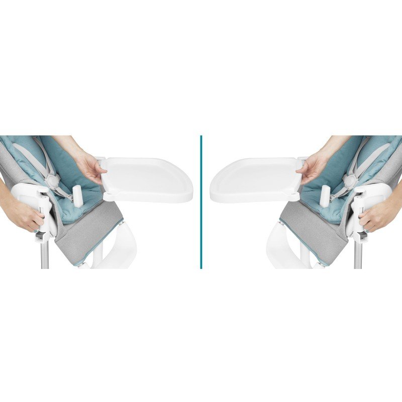 V revolučním designu lze pultík židličky snadno otevřít do obou stran. Před sezením dítěte jej tedy nemusíte zcela odstraňovat. Stiskněte tlačítko a pultík otočíte jednoduše jen doprava nebo doleva. Vaše dítě je pak snadno a bezpečně usazeno. Jakmile je dítě nakrmené, jednoduše pultík otočíte, uvolníte bezpečnostní pásy, a dítě je volné.