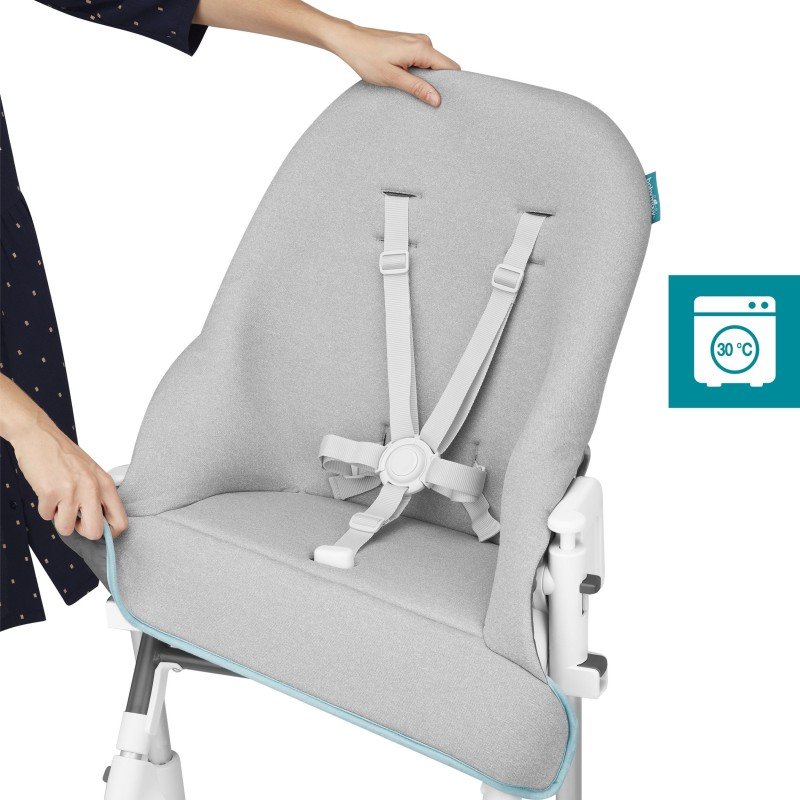 Pro snadné čištění je sedadlo židličky Slick vyrobeno z vodoodpudivé textilie Nanotex™. Sedadlo i novorozenecká výplň mají odnímatelný potah, který lze prát při 30°C. Pultík lze zcela odejmout  a mýt jej v myčce.