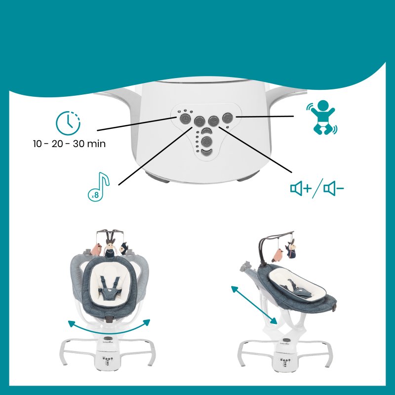 • nastavitelná doba houpání (10-20-30 minut) a nastavitelná hlasitost