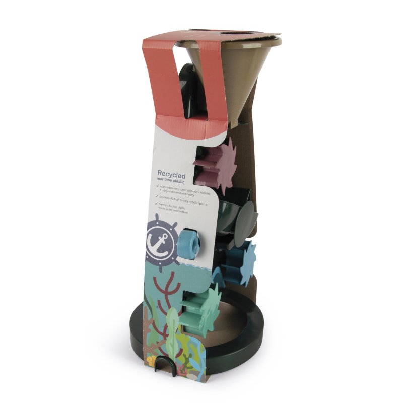 Krásná sada s lopatkou, bábovičkou a velkým mlýnem, kterým "protéká" písek i voda. Sada poskytuje mnoho příležitostí pro smyslovou hru a poznávání přírody na pláži nebo v pískovišti a posiluje jemnou dětskou motoriku a koordinaci očí a rukou. Hračka je vyrobena z recyklovaného rybářského a námořního vybavení (ze sítí a lan, které by jinak skončily na dně oceánu).
