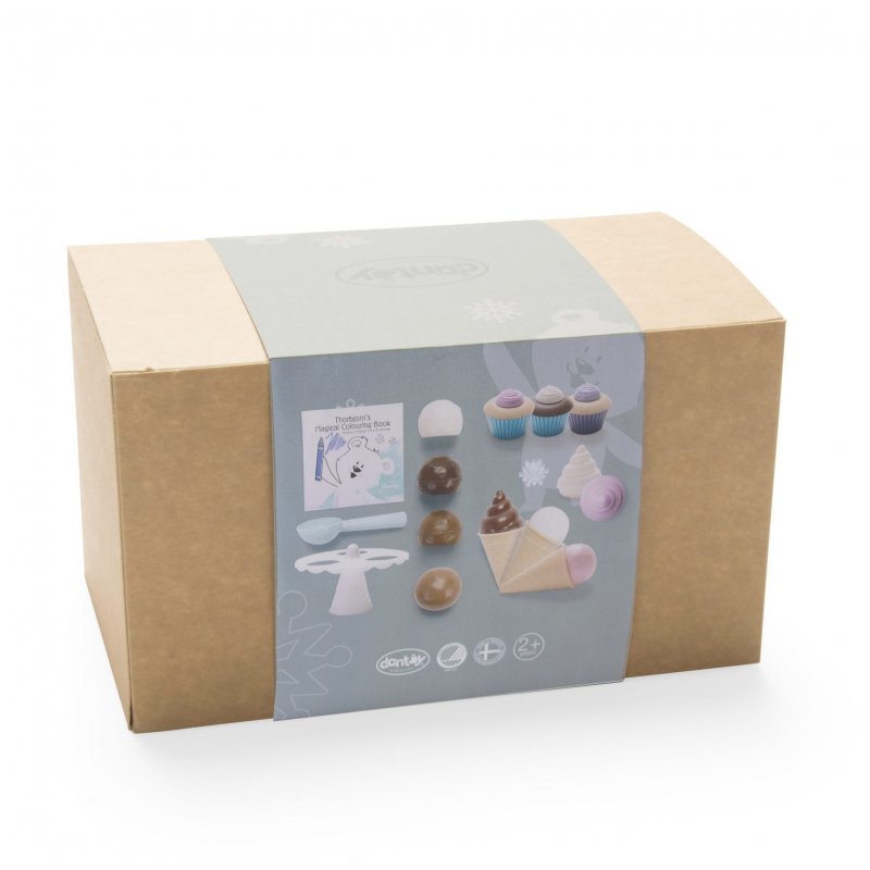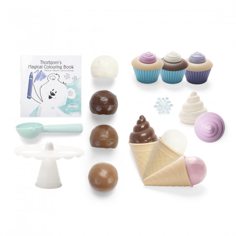 Krásná dezertní sada obsahující zmrzlinové kornouty, kopečky zmrzliny, zákusky a další ozdobné doplňky. V přiloženém stojánku můžete připravovat různé druhy zmrzlin a dortů v nekonečných kombinacích a krásně je aranžovat. Součástí jsou i pěkné omalovánky, ve kterých si můžete vybarvit kouzelný svět medvídka Thorbjorna a jeho přátel. Tato sada vybízí ke hře a učení a je ideální pro vnitřní i venkovní použití.