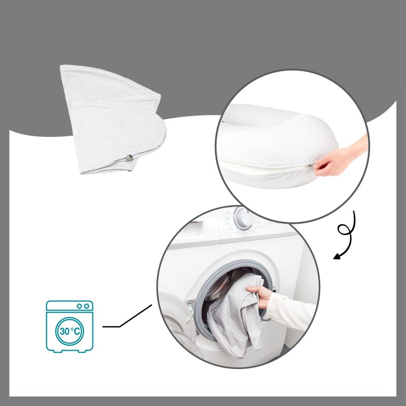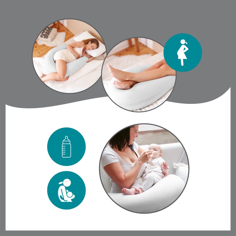 Po narození miminka nabere polštář nový život! Lze jej použít pro snadnější kojení nebo krmení z láhve či pro podložení miminka. Mírně zkosený tvar polštáře umožňuje položit miminko do potřebné výšky a pohodlné pozice. Navíc, jednoduchý upevňovací systém drží polštář na místě a ponechává mamince volné ruce pro krmení děťátka.