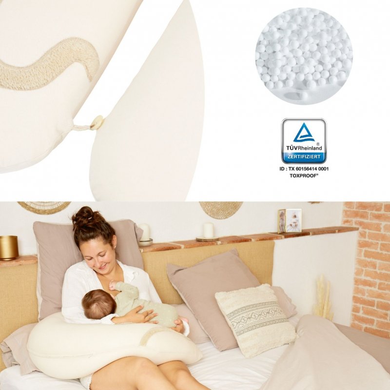 Po narození miminka nabere polštář nový život! Lze jej použít pro snadnější kojení nebo krmení z láhve či pro podložení miminka. Mírně zkosený tvar polštáře umožňuje položit miminko do potřebné výšky a pohodlné pozice. Navíc, jednoduchý upevňovací systém drží polštář na místě a ponechává mamince volné ruce pro krmení děťátka.