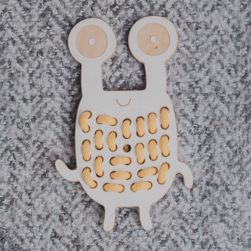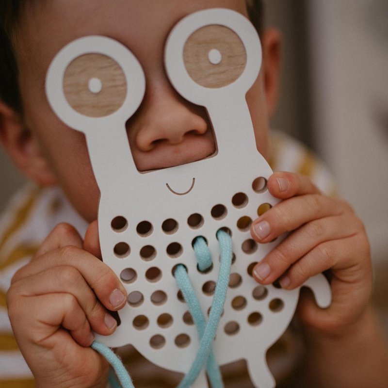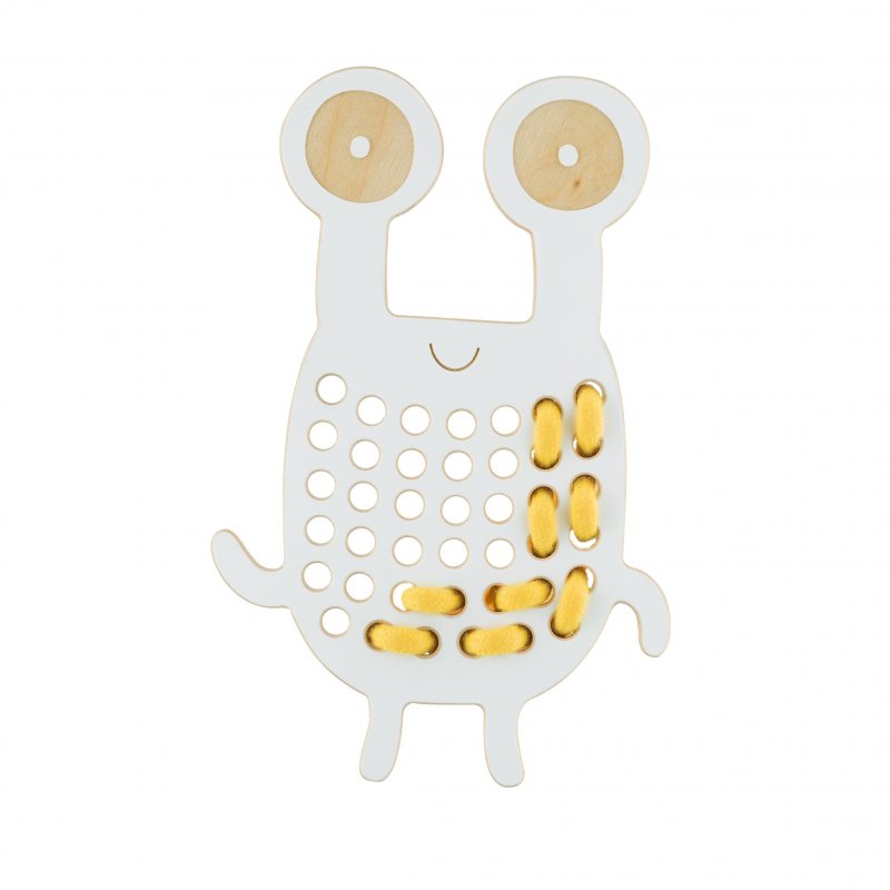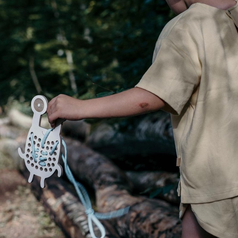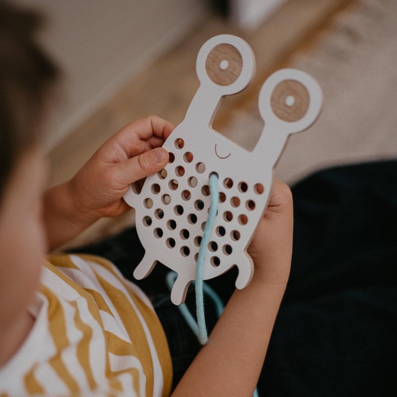 Dřevěná provlékací hračka rozvíjející kreativitu a představivost. Provlékání zvířátek šňůrkami představuje nejen radostný způsob zábavy, ale zároveň napomáhá v přípravě dětí na psaní ve škole. Rozvíjí manuální zručnost a jemnou motoriku. Trénink koordinace oko-ruka podporuje jazykové dovednosti a vytváření nových nervových spojení v mozku.