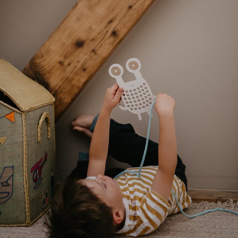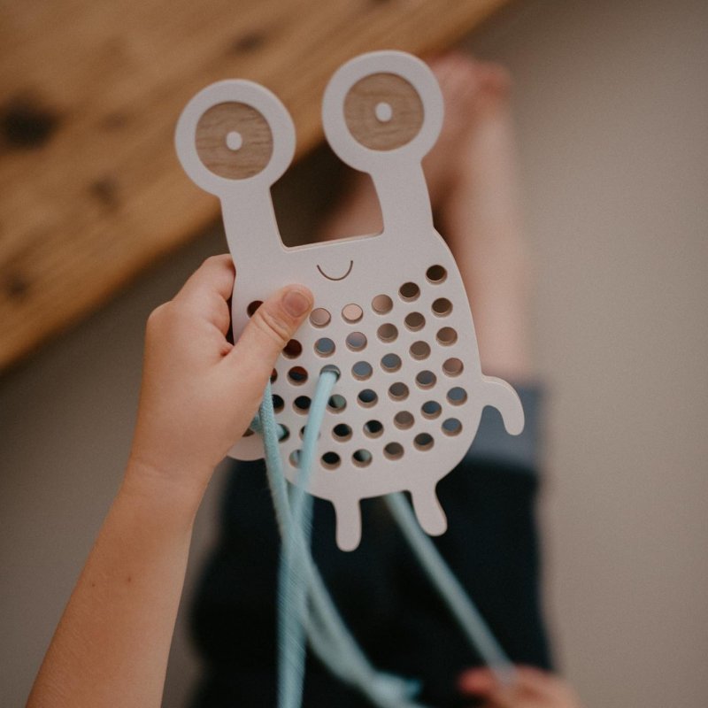 • dřevěná provlékací hračka pro rozvoj kreativity, fantazie a jemné motoriky