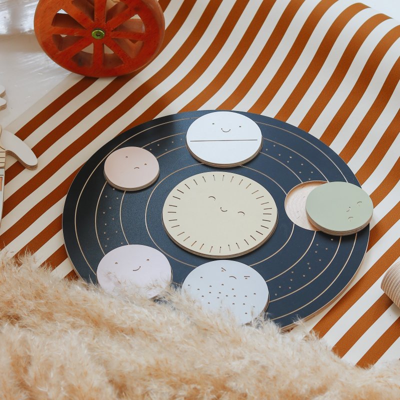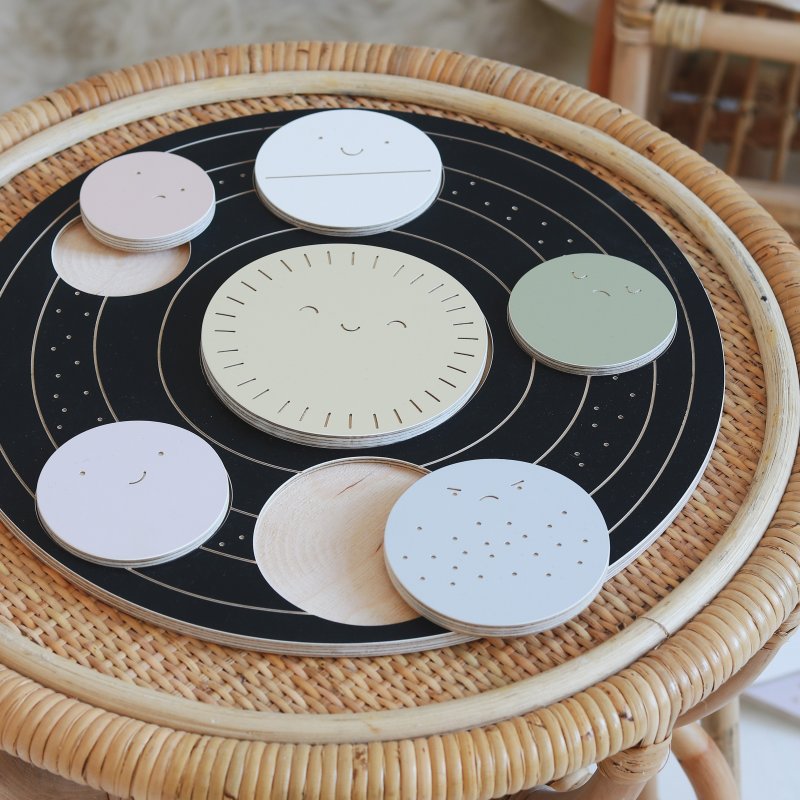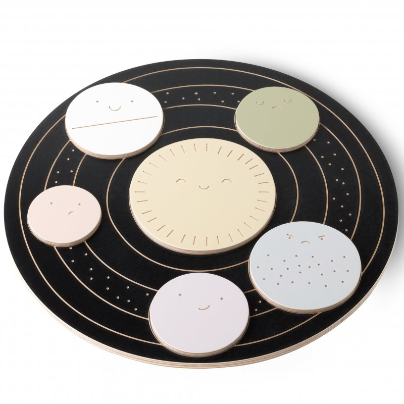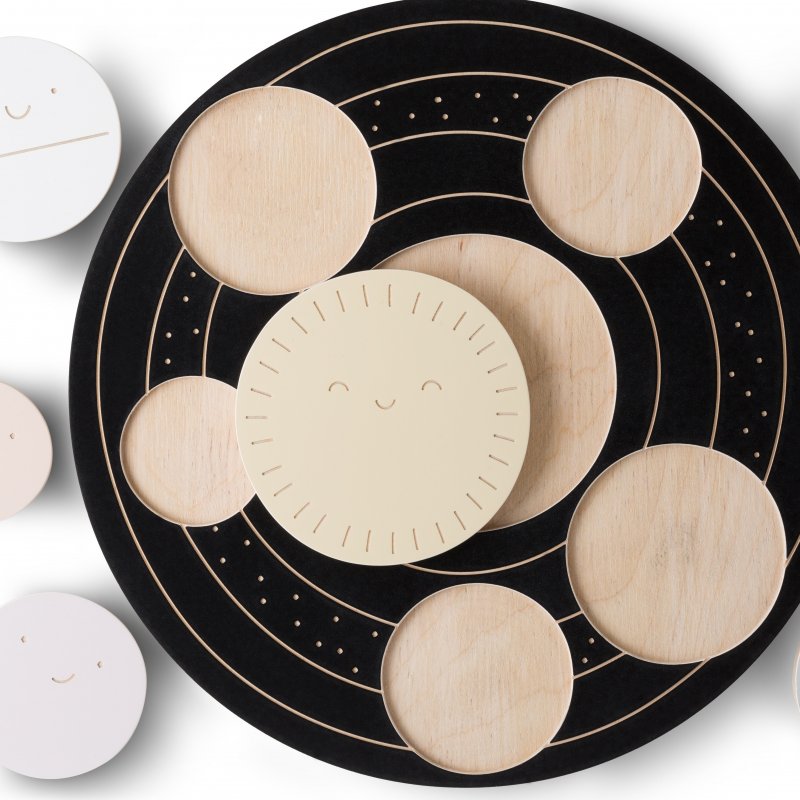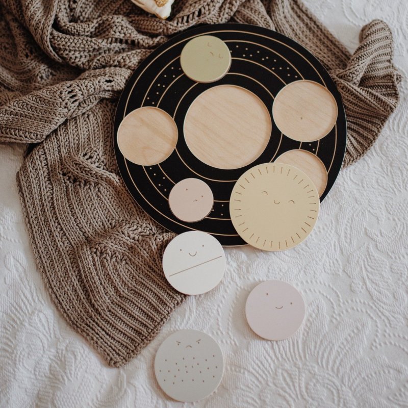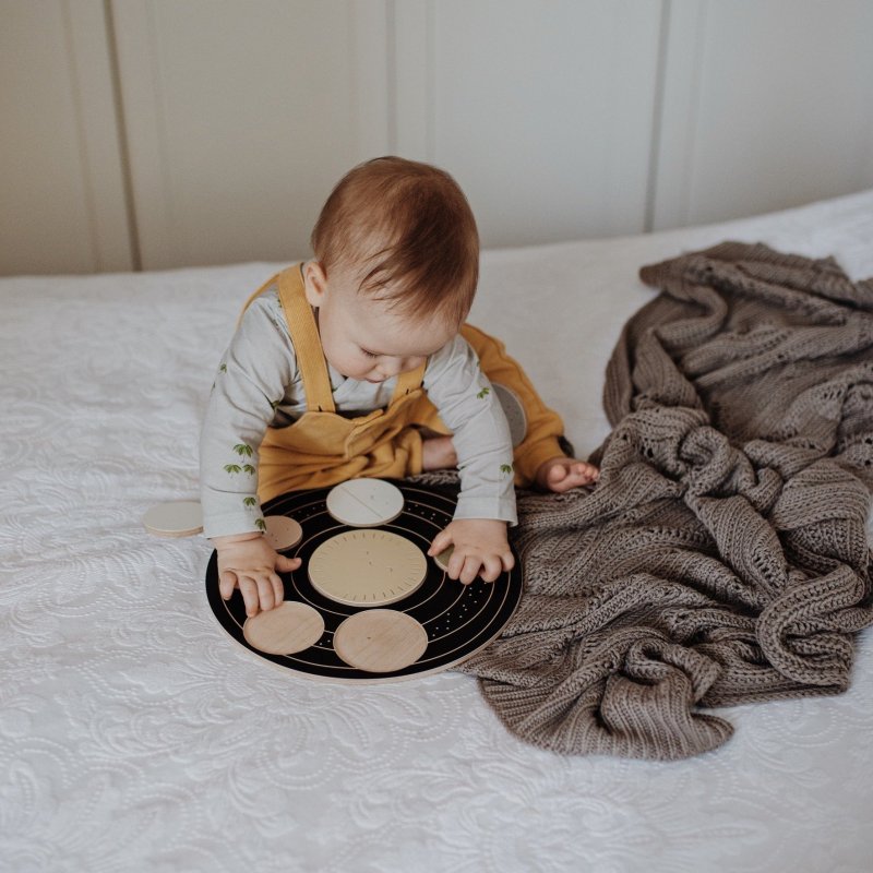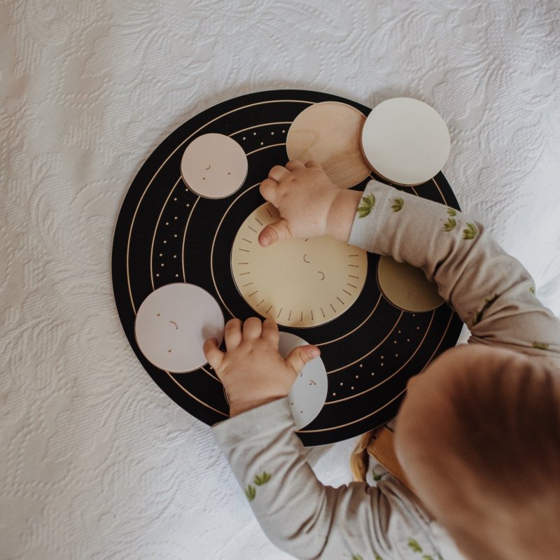 Dřevěný kruh s vyříznutými, různě velkými prohlubněmi. Úkolem dítěte je přiřadit 6 planet do příslušných otvorů. Ideální pro cvičení logického myšlení a rozvoj koordinace oko-ruka.