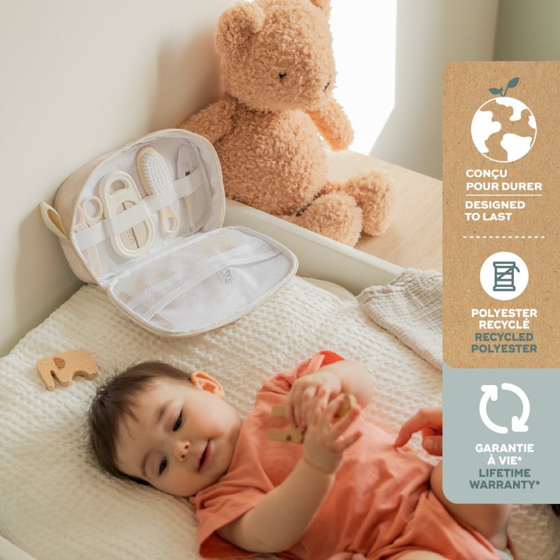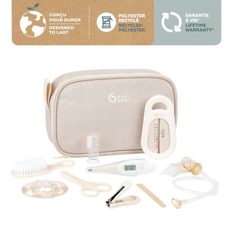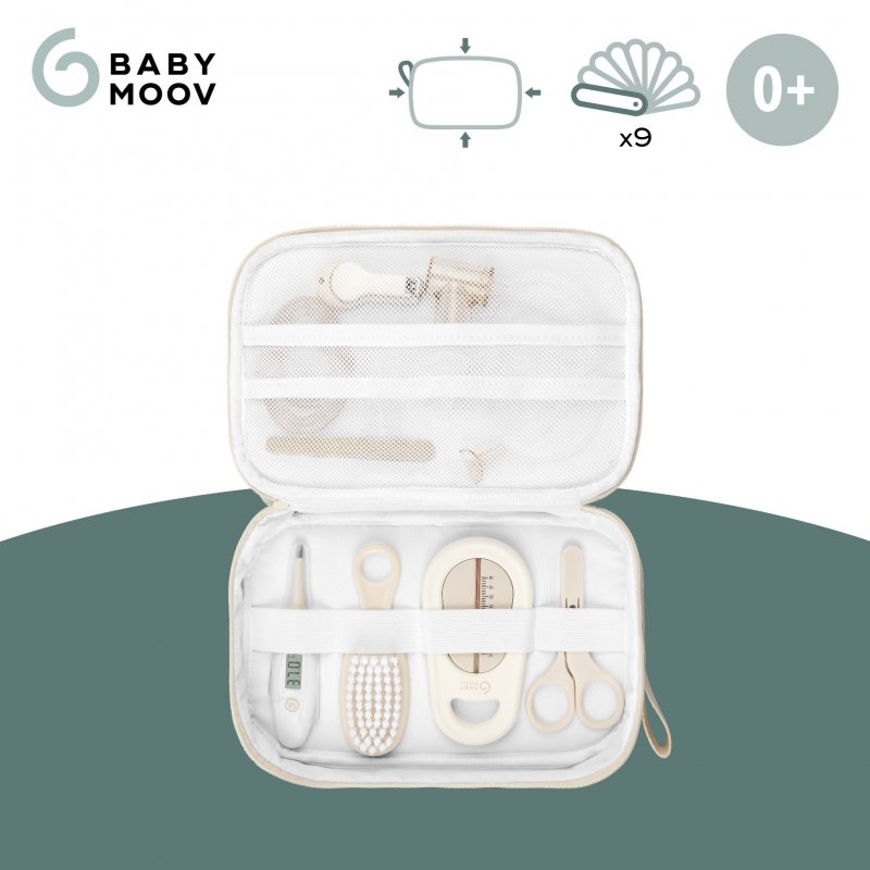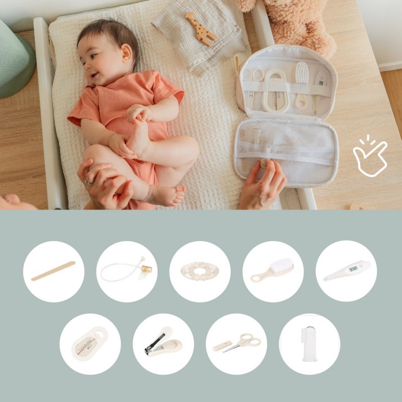 - obsahuje 9 kusů: nosní odsávačku (odsávání pomocí náustku, hleny se shromažďují v uzavřené komoře), kousátko, kartáček na vlásky, kartáček na zoubky, teploměr do vody, rektální teploměr, pilník, kleštičky a kulaté nůžky na nehtíky