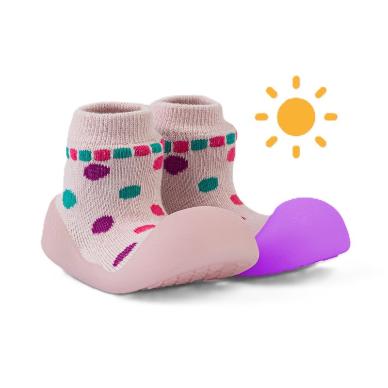 Ponožkové botičky Chameleon byly navrženy s jediným cílem: spojit zdravý vývoj chodidla s radostí a zábavou! Podporují nejen zdravý vývoj chodidla, ale také přinášejí radost a motivaci k prvním krůčkům díky své schopnosti měnit barvy! Chůze v těchto botičkách dopřává dostatek prostoru pro prstíky a umožňuje neustálý kontakt se zemí. Volná špička podporuje správný vývoj chůze a nebrání krevnímu oběhu dětské nožky. Chození v ponožkobotkách je velmi podobné přirozené chůzi naboso, což je prospěšné nejen pro nohy, ale i pro celý organismus. Botičky Chameleon mají navíc unikátní funkci změny barvy podrážky - reagují na okolní prostředí způsobem, který děti naprosto fascinuje a motivuje k pohybu a zkoumání okolního světa - při kontaktu se slunečními paprsky mění podrážka svůj barevný odstín, což vytváří pro malé objevitele kouzelný zážitek při každém krůčku.