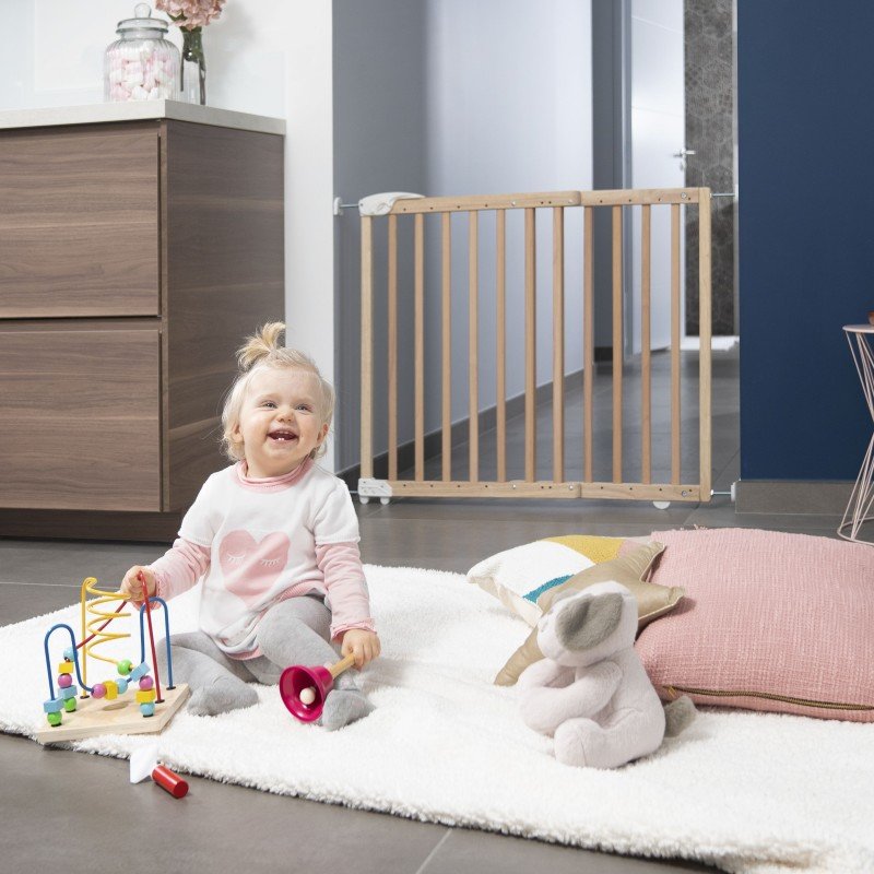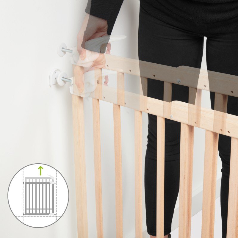 Upevnění zábrany pomocí tlaku se doporučuje pro příležitostné použití např. u prarodičů nebo pro zabránění přístupu do kuchyně. K udržení na místě je nutný dveřní rám nebo pevná kolejnice. Výhodou je, že nemusíte vrtat zeď! Zábrana Deco Pop je v tomto případě zcela odnímatelná. Otevírá se jednoduše nadzvednutím.