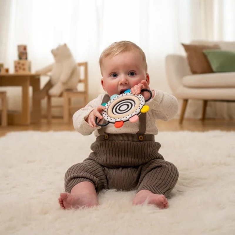 Zrcátko s jednoduchým, ale promyšleným designem, který kombinuje přírodní materiály s moderními prvky. Dominantním prvkem této hračky je kulaté zrcátko, jehož rám tvoří kombinace dřeva a plastu. Dřevěná část dodává výrobku přírodní vzhled a příjemný hmatový vjem, zatímco plastová část zajišťuje bezpečnost a odolnost při každodenním používání. Oba materiály jsou pečlivě opracovány tak, aby byly zcela bezpečné pro dětské ruce i ústa, bez ostrých hran nebo škodlivých látek.