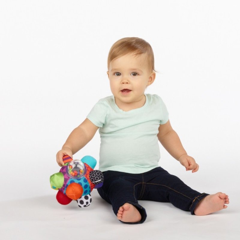 Pestrobarevný míček s velkými hrbolky, které povzbuzují k natahování, uchopení a přenášení z jedné ruky do druhé. S kuličkami, které při hře vydává příjemný zvuk. Pestrá kombinace barev a různorodých materiálů se dokonale hodí pro ruce malých průzkumníků a zároveň stimuluje jemnou motoriku, rozvíjí představivost a podporuje celkový rozvoj dítěte.