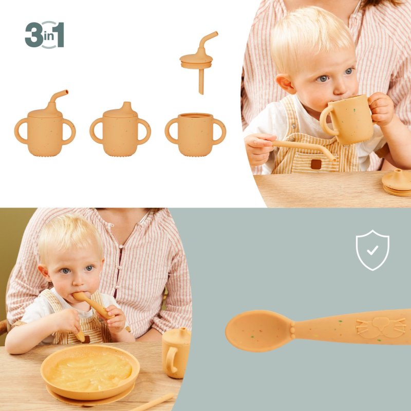Silikonová jídelní sada Grown-Up je ideálním společníkem na cestě za objevováním nových chutí a textur. Je navržena tak, aby rostla s děťátkem a poskytla mu podporu při samostatném jezení, ať už doma nebo na cestách. Tato praktická sada obsahuje vše, co dítě potřebuje: talíř s vyvýšeným okrajem, který zabraňuje rozlévání, přizpůsobitelný hrníček 3v1 a měkkou celosilikonovou lžičku. Díky této sadě si dítě osvojí dovednost samostatného, bezpečného stolování.