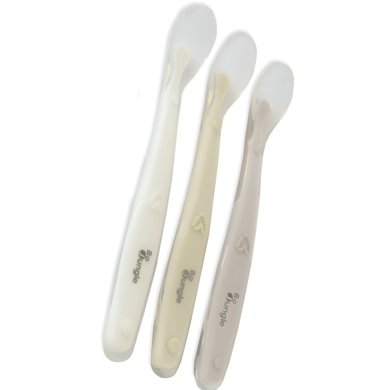 Jídelní lžičky s měkkými silikonovými zakončeními, které jsou šetrné k citlivým dětským dásním.